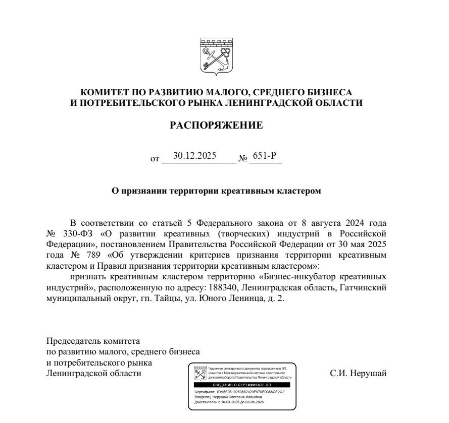«Бизнес-инкубатор креативных индустрий» в Тайцах признан креативным кластером. Комитет по развитию малого, среднего бизнеса и потребительского рынка издал соответствующее Распоряжение.